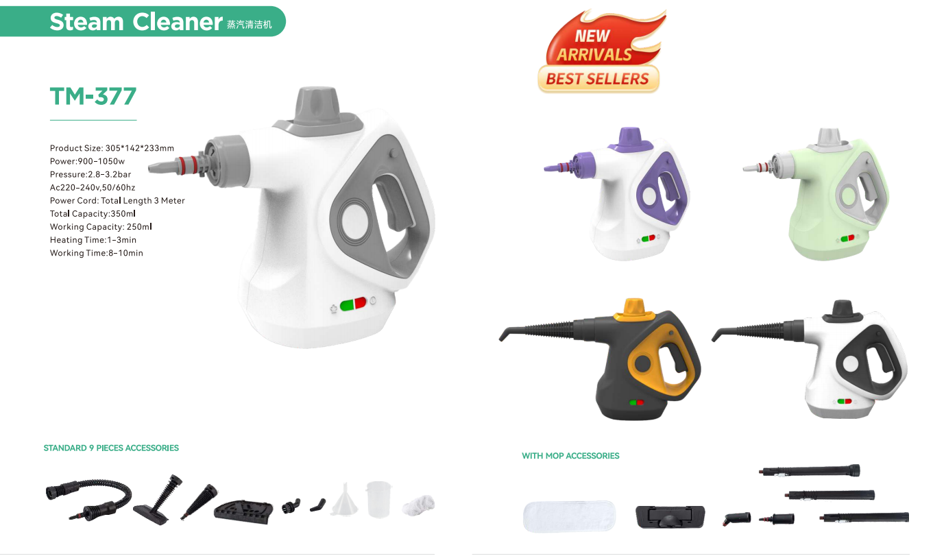 The TM-377 Handheld Steam Cleaner for Home Multi-Surface Steamer Kit comes with 9 standard accessories, including a long spray nozzle, bent nozzle, round brush nozzle, and extension hose, making it suitable for cleaning various surfaces such as floors, windows, kitchen countertops, and fabric upholstery. The 3-meter power cord offers flexibility for larger areas, while its lightweight and compact design make it easy to maneuver and store.This handheld steamer is an effective solution for deep cleaning and sanitizing, providing a safe, chemical-free way to clean your home.